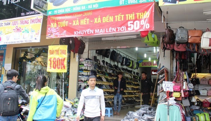 | Cửa hàng Giày dép phố Chùa Bộc với tấm biển: “Xả tuốt – xả hết – xả đến tết thì thôi” |